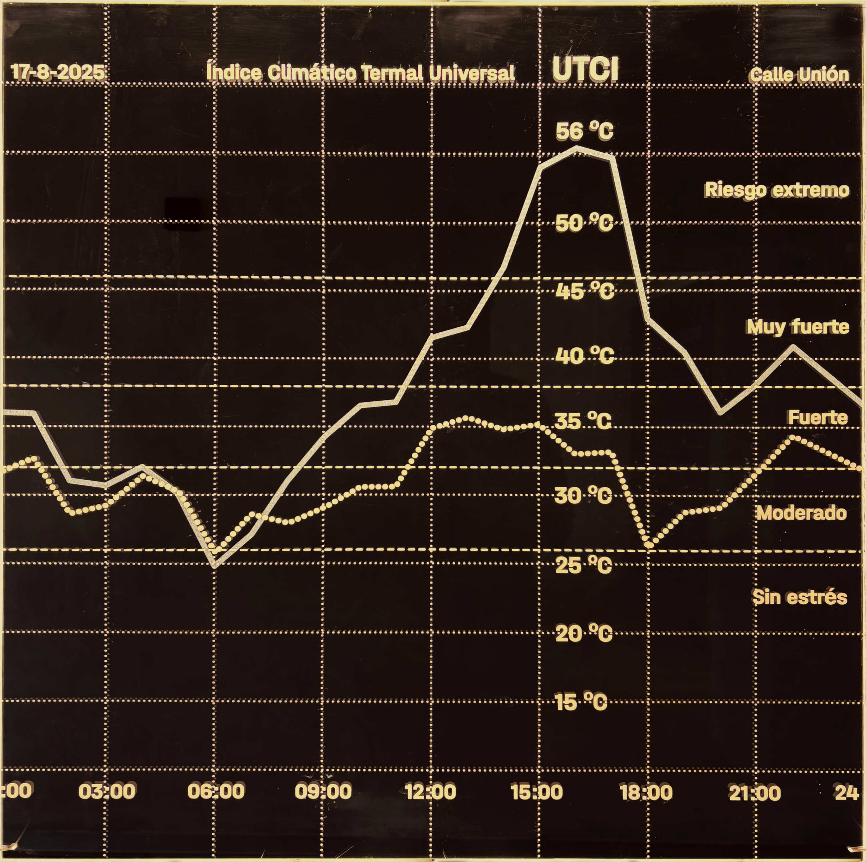 5. UTCI 17/08/2025: es un índice que evalúa el impacto de múltiples variables sobre el cuerpo humano. En este caso, el confort térmico mejora notablemente con los emparrados, pasando de riesgo extremo o muy fuerte a rangos fuertes o moderados la mayor parte del tiempo.