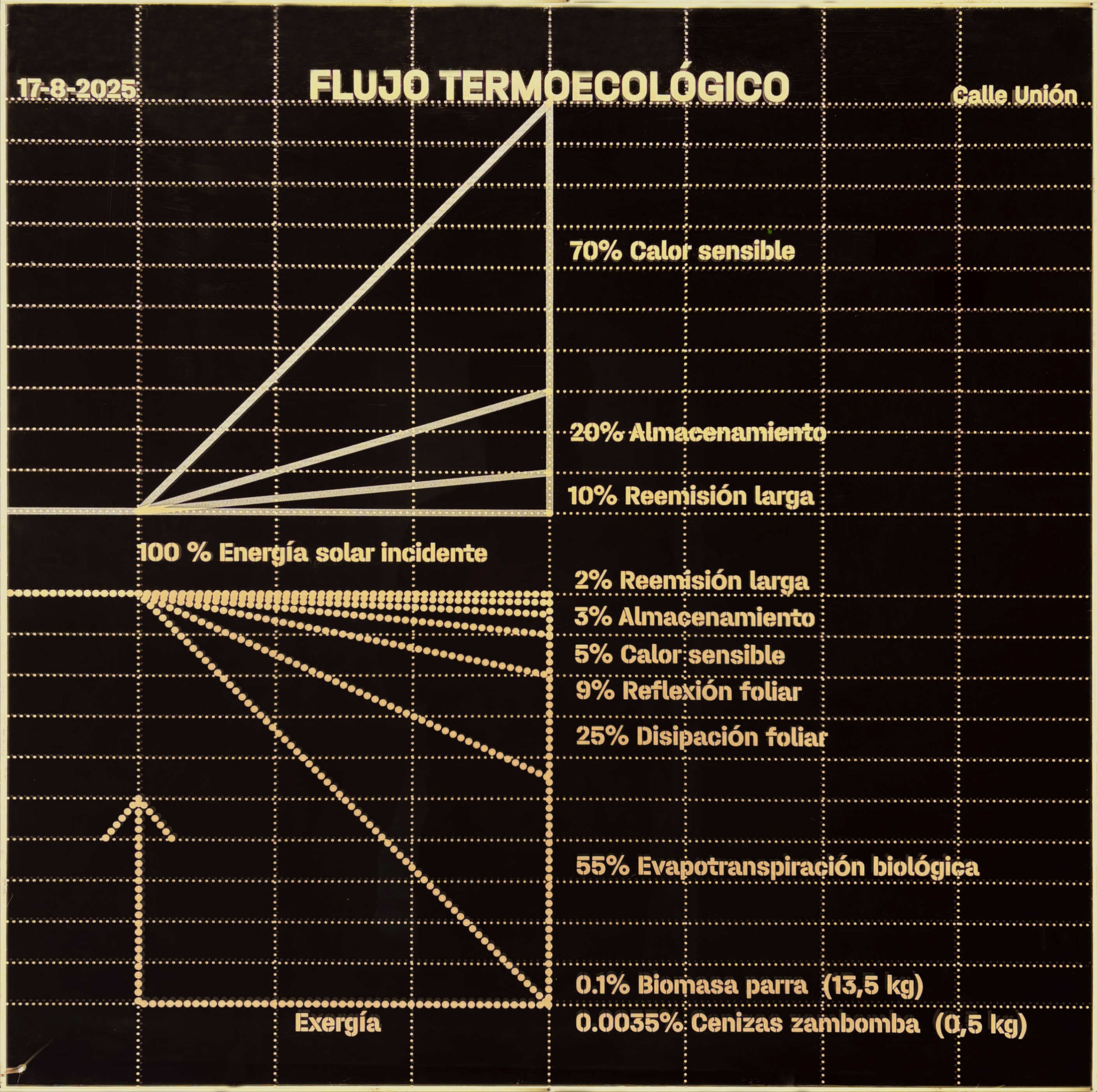 6. Flujo termoecológico 17/08/2025: este diagrama de Sankey muestra cómo bajo el emparrado solo un 10% de la energía solar se convierte en calor (100% en los otros casos) y alrededor de un 1% se transforma en biomasa, y entre un 0,03-0,04 % en cenizas para esmaltes de zambomba.