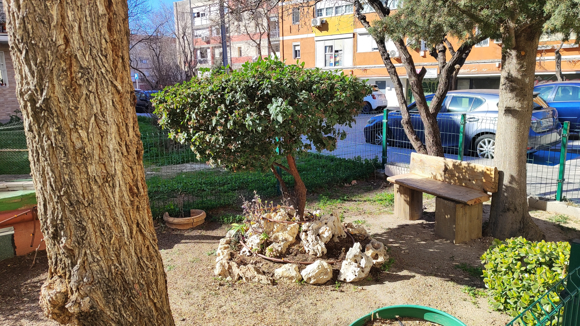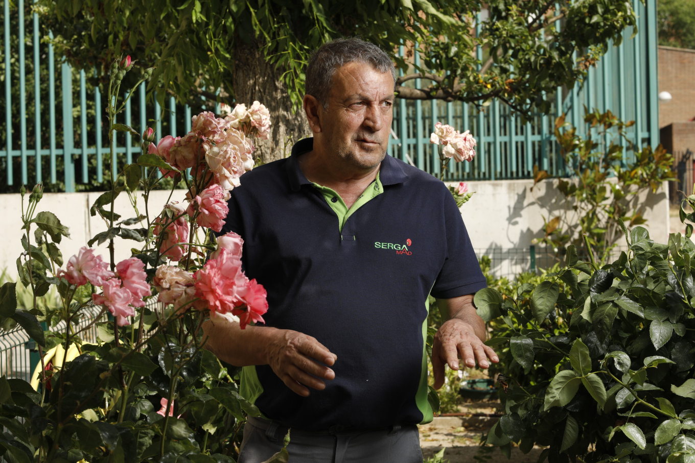 Por la valla pensamos que el jardín pertenecía a la comunidad de vecinos y que sería el portero el jardinero en la sombra. Así que entramos en el portal. Allí estaba Benito, tranquilo, con su uniforme de trabajo. Le preguntamos si era él su cuidador. Con serenidad y sin deconfianza nos contestó que sí. Le felicitamos y le pedimos si podía salir a contarnos su jardín.